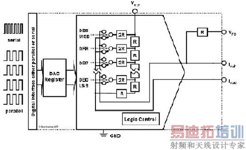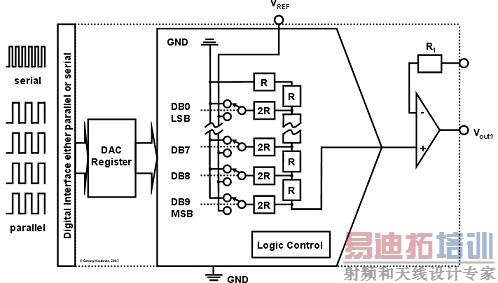 其外部参考电压没有和 R2R梯形直接连接。根据不同的数字输入代码,开关将通过 R2R 网络把参考电压或接地电平连接至输出缓冲器,该输出缓冲器将所生成的电压信号转换成输出电压。