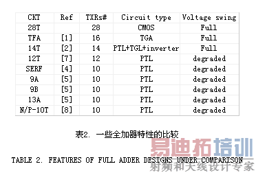 一些其他的全加器设计将用来和本文的全加器比较,因为设计的目标是降低电路的复杂性和提高电路的速度以及能量损耗的降低,所以主要关注于门数少并基于传送门的全加器之间的比较。已有的全加器总结如下表2。