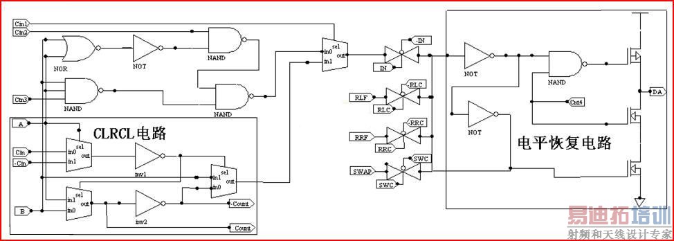 前面提到了本文中提出的电路会有两个阀值电压的损失,为了后续电路的正确工作我们可以加一个电平恢复电路,同时这个电路还可以加快电路的传送速度(见Figure 2右半部分),在此恢复电路中我们使用了一个控制信号(Cnt4)来实现三态门的功能以控制信号的输出与否。加上这部分电路后输出信号会取反,在许多处理器中信号采用的是补码形式,而这为补码的实现提供了便利。