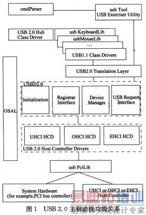 USB体系结构是基于主从结构的,USB的驱动程序设计指的是主机端的驱动程序。图1给出了VxWorks操作系统下USB主驱动栈各模块之间的功能关系。