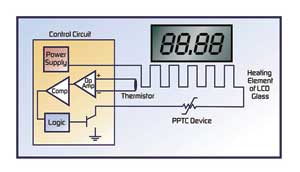 安装一个独立于加热元件控制器的PPTC器件,就能够保护LCD和加热器的控制电路,避免温度过高而造成损坏。如图1所示,PPTC器件一般放在电源和加热器之间的连接线路中,并置于LCD热传导回路中,这样一来,LCD产生的热就能传导到PPTC器件上了。当LCD的温度达到某一个预定温度时,PPTC器件的电阻迅速上升,发热元件中的电流便随之下降。一旦故障排除,并且重新上电,这个电路还会恢复到正常的工作状态。