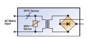 交流电源出现的一些过载状况可能会导致压敏变阻器仍然处在钳位状态,这时电流会继续流过,最终可能会导致这个器件因过热而损坏。把PPTC器件装在金属氧化物压敏变阻器附近,就可以密切地监控压敏变阻器的发热状况。在压敏变阻器长时间过载的情况下,它的热量会传送到PPTC器件上,使PPTC器件更快地转变为高阻状态,限制压敏变阻器中的电流,从而保护压敏变阻器不致烧坏。