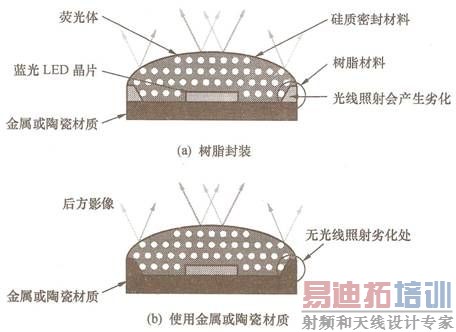 停止使用树脂封装可以彻底消灭劣化因素,因为白光LED产生的光线在封装树脂内反射,如果使用可以改变芯片侧面光线行进方向的树脂材质反射板,由于反射板会吸收光线,所以光线的取出量会锐减,这也是采用陶瓷系与金属系封装材料的主要原因。LED封装基板无树脂化结构如图3所示。