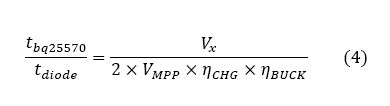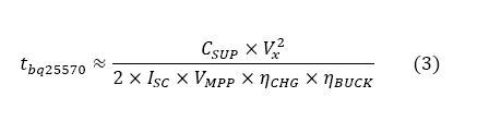 使用这种方法为超级电容器充电的最大不足在于时间。超级电容器从完全放电状态充电所需的时间非常漫长。由于在冷启动过程中该器件的效率大约为7-10%,而且太阳能电池在冷启动过程中的电压调整在接近0.33V,因此传输到超级电容器的电源非常微弱。这样会严重延长充电时间。当超级电容器上的电压到达大约1.8V时,该器件的效率就会明显提高,可超过二极管充电解决方案。使用升压充电器在冷启动过程中将超级电容器充电至VX所需的时间可用等式2计算。