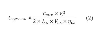在降压转换器输出端为超级电容器充电的主要使能因素是降压转换器中的持续欠压保护特性。这可持续监控VSTOR上的UV阈值,一旦VSTOR上的电压降至低于2V阈值便禁用降压转换器。如果没有该特性,当启用降压转换器为超级电容器充电时,较小的100 F电容器就会损坏。在超级电容器器充电过程中,VSTOR调整在大约2V。当超级电容器达到VOUT设置点1.8V时,充电器会将VSTOR抬高到过压设置点4.2V。将超级电容器充电到Vx所需的时间可用等式3计算。
