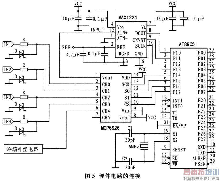 设计要求4路温度检测通道和l路冷端补偿电路,所以本设计采用MCP6S26型6通道增益可编程放大器,该放大器特别适用于多路信号采集电路的设计,由于AT89C51单片机可以通过软件对模拟信号电路进行控制,所以其适应性和灵活性大大提高。但是,由于AT89C51型单片机没有3线制串行总线接口,它与MCP6S26进行3线制串行总线的连接时,要使用软件来模拟3线制串行总线的操作,包括串行时钟数据输入和数据输出。McP6S26与AT89C51的连接如图5所示。图中,P17模拟片选 端CS,P14模拟时钟输入端SCK,P16模拟数据输入端SI,P15模拟数据输出端SO。