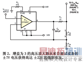 一个得到轻微补偿、增益为3的高压OPA551放大器IC4依靠±30V电源工作,从普通的±7V ATE(自动测试设备)电压获得高达±22V 的强制电压(图2)。如果待测器件发生灾难性的短路,则保险丝F1会限制来自IC4(它可能带来高达380mA的短路电流)的故障电流,由此防止进一步的损害。