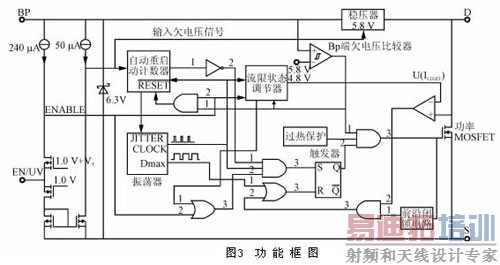 图3为TinySwitch-Ⅱ的功能框图。其内部集成了一个耐压为700V的功率MOSFET和一个开/关控制器。与传统的PWM控制器不同,它使用一简单的开/关控制器来稳定输出电压。振荡器的频率为132kHz,振荡器中还增加了频率抖动电路,抖动量为±4kHz,该功能使EMI的均值和准峰值噪声均较低。
