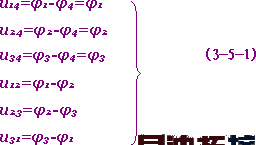 将所求得的φ1,φ2,φ3代入式(3-5-1)即可求得各支路电压。在求支路电流时,同样应先设定它们的大小和参考方向横。若设定4各支路电流的大小和参考方向如图3-5-1中所示,则即可根据式(3-5-3)求得各支路电流。