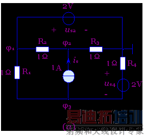这样,该电路就只有两个未知的节点电位φ2和φ3。对应的节点方程为