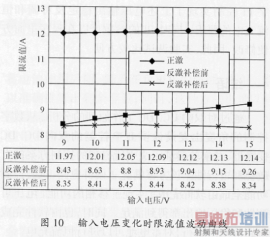图10则给出了正激,反激补偿前和反激补偿后实测限流值随输入电压变化的曲线。正激变换器限流值随着输入电压变化基本不变,而反激变换器限流值在补偿前随输入电压的变化有较大的波动。但是,在加了补偿电路之后反激变换器限流值的稳定性有了明显的改善,证明了该补偿电路的有效性。