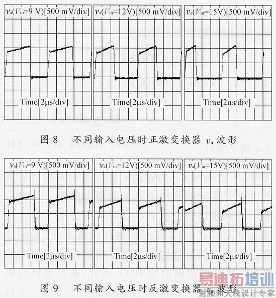 图8及图9分别给出了输入电压分别为9V,12V,15V,电路满载工作时正激变换器和反激变换器限流保护电路va的波形,与图5和图6的理论波形也是一致的。