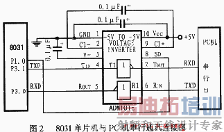 只需要几个电容,用ADM101E就可以非常简单地实现单片机与PC机之间的串行通讯,图2所示为8031单片机与PC机通过ADM101E进行接口的应用电路。