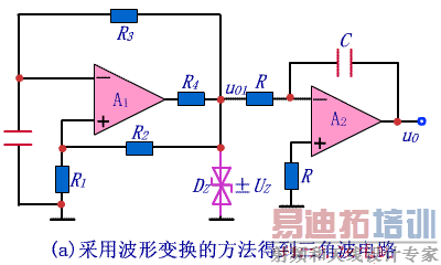 如图(a)所示,将方波电压作为积分运算电路的输入,在积分运算电路的输出就得到三角波电压,波形如图(b)所示。