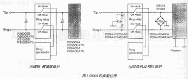 图1(e)是把DSSA用作浪涌吸收元件的手持电话系统(PHS)的保护电路。图1(f)是调制解调器二级保护方案。图1(g)示出是交换机、专用小交换机(PBX)的保护电路。初级保护用作吸收键接时的浪涌;次级保护用作抑制脱钩浪涌,使电话用户线接口电路(SLIC)免遭损坏。