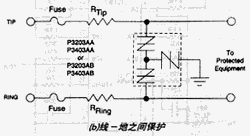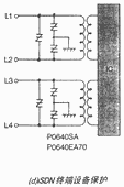 图1(c)为低压数据接口电路的保护方案之一。图1(d)是DSSA应用于综合业务数字网(ISDN)终端设备的保护电路。