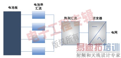 在典型的太阳能电子系统中,各个太阳能电池板或模块通过串联来提高输出电压,并提高效率。许多电池串需要并联使用以获得要求的输出电流和最终功率。根据系统规模和设计细节,并联电池串可以在电池串汇流箱中实现连接,而电池串汇流箱则在阵列汇流箱中实现并联,然后再连到逆变器(图2)。