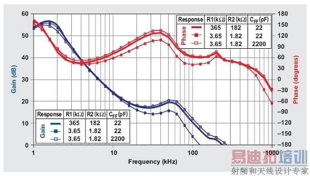 图5:不同R1、R2和CFF值的降压转换器闭环频率响应。