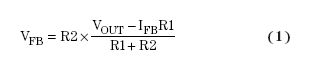 我们刚刚讨论了如何利用大反馈电阻来提高效率。然而,选择的电阻过大则会影响转换器的输出电压精确度,因为存在进入转换器反馈引脚的漏电流。图2显示了电阻式反馈分压器(R1和R2)的电流通路。反馈漏电流(IFB)固定不变时,R1的电流(IR1)随着R1和R2值增加而减小。因此,分压器电阻增加也就意味着进入反馈引脚的IR1漏电流百分比更大,并且R2的电流(IR2)降低,从而产生低于预期的反馈引脚电压(VFB)。我们将VFB同一个内部基准电压比较,以此来设置输出电压,因此反馈电压的任何一点误差都会导致输出电压不精确。我们可以由基尔霍夫(Kirchhoff)电流定律推导出方程式1,其表明VFB为R1和R2的函数: