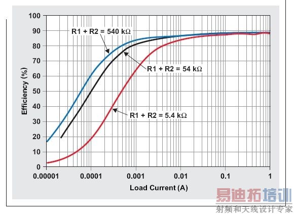 图1表明,反馈电阻较低时,低负载的效率下降。本例中,我们使用(TI)TPS62060EVM,其中VIN=5V,VOUT=1.8V,并且启用节能模式。在高负载电流下,负载功耗远大于电阻式反馈网络的功耗。这就是不同R1和R2值的效率会集中在高负载电流的原因。但是,在低负载电流下,不同反馈电阻的效率差异更加明显。这是因为,分压器的电流主导了负载的电流。因此,要想拥有更高的轻负载效率,一种较好的设计方法是使用产品说明书单中建议的大反馈电阻值。如果在某个特定设计中轻负载效率并不重要,则可以在对效率无明显影响的情况下使用更小的电阻。