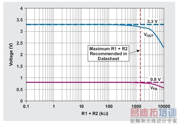 方程式1和TI TPS62130降压转换器用于绘制反馈引脚电压及相应输出电压情况,其为反馈分压器电阻的函数(请参见图3)。该电压图基于理想电阻,其可产生一个3.3V的输出电压,并且反馈引脚电压为0.8V。需要考虑的唯一误差项是产品说明书中规定的100Na最大反馈漏电流。