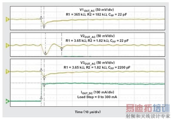 图6:不同R1、R2和CFF值的降压转换器负载瞬态响应。