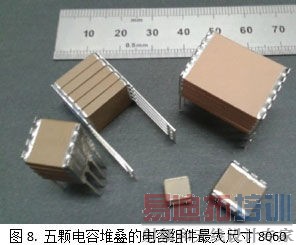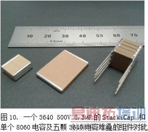 图7显示了已经研发的StackiCapTM的各规格产品尺寸:1812,2220,2225和3640。图8显示了最多5颗电容叠加的引脚电容组件,单个电容尺寸为2225,3640,5550和8060。图9和图10显示了单个StackiCapTM电容器所能取代的电容组件。一个极端的例子是8060,1kV,470nF的电容如今可被单颗