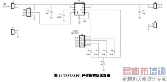 TPS7A8101 评估板初始原理图如图11所示,由上节的测试结果可知,采用该电路给TRF3765供电,RMS 抖动为0.62ps。
