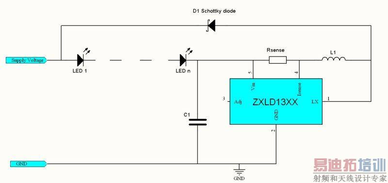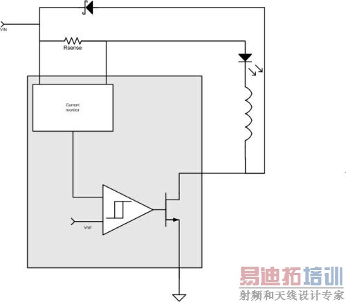 对于降压LED控制器来说,最好使用高侧电流检测方式,此时LED位于电流检测电阻和电感之后。迟滞转换器的简单特性提供了共阳极的LED驱动方案。