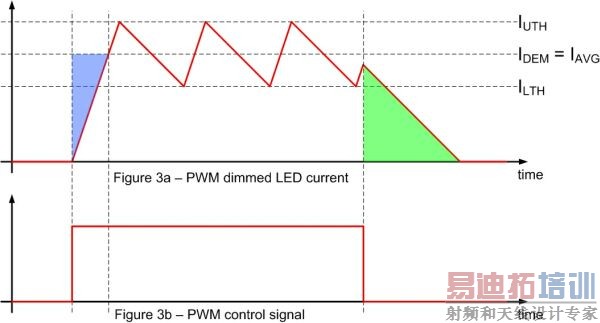 图3b所示的PWM波形是用于控制LED亮度的8位信号的最高位。对于理想的调光电路来说,将PWM信号驱动到高将导致电路立即起振,此时平均值等于I(SUB/)AVG(/SUB),当PWM信号驱动到低时电流立即降低到零。图3a中的曲线表明,有两大因素会导致输出电流误差,如图中阴影区指示的那样。在初始上升(蓝色阴影)期间电流应等于I(SUB/)AVG(/SUB),因为这段时间的平均电流很低。同样,在最后的下降期间电流应等于0,但绿色阴影区表明事实不是这样。如果LED电流的占空比等于50%,那么上升/下降摆率是相同的,这两个误差也不会存在,但实际占空比经常不是50%。如果在PWM导通周期内转换器执行许多次振荡,那么这些误差效应将可以忽略。