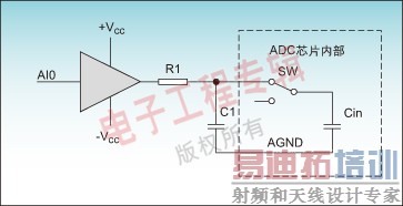 大多ADC芯片内部的模拟输入端都具有一个采样电容Cin,电阻R1对运放输出限流,数倍于采样电容的陶瓷电容C1使得开关SW合上的瞬间,通过C1迅速给采样电容Cin充电。R1、C1的具体数值,与运放的稳定性、建立时间、ADC采样时间、需要的采样精度有关。