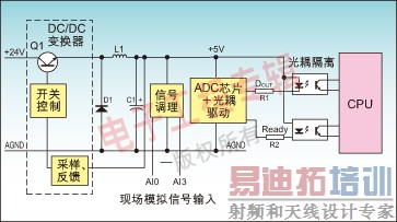 图1是一个典型的应用,其中模拟采样用的信号调理电路、ADC和现场模拟信号不隔离,ADC芯片和CPU电源相互隔离。CPU采用控制系统内部电源。而ADC的+5V电源是由+24V电源经过+24V到+5V电源变换而来的。图中左侧部分是典型的串联、降压非隔离型DC-DC变换器的原理框图。设计中,可以根据开关管的开关频率、+5V消耗电流、要求的输出纹波最大值,计算出电感L1、电容C1的合适大小。