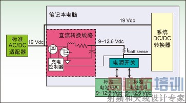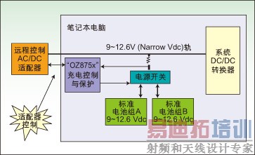 当前,笔记本的输入直流电源设计包含电源适配器(Adapter)和锂离子电池模块,两部分输出电压的不同造成系统输入电压的大范围变化。使用锂离子电池模块的输入电压为9至12.6V,而来自电源适配器的输入电压大部分为15V-19V,因而笔记本电源设计需要考虑提供两种电压(一般输入电压范围定在7V-21V范围),如图1所示。