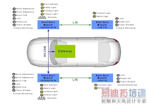 图1:当前在路面上行驶的各种汽车中所见到的标准高端前门模块的典型系统架构图。