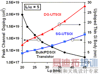 图6 所示为体MOSFET与超薄(UT)SOI所需的沟道掺杂之间的比较,以为给定Lg实现相同的短沟道控制(SG: 单一门栅,;DG: 双门栅;PD-SOI: 部分损耗的 SOI)。