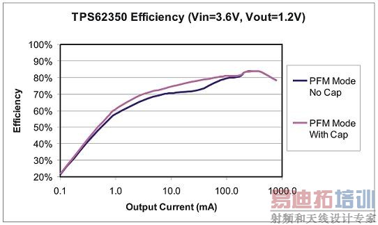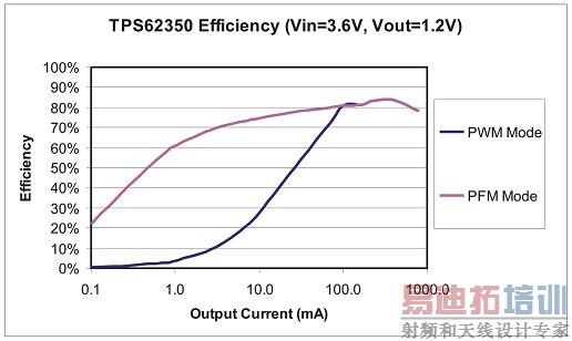 在非转换期间,转换器关闭所有非必须的内部电路,从而显著降低了其静态电流。唯一处于工作状态的内部电路就是带隙参考电压和一个用来监控输出电压的比较器。因为没有发生转换,所以所有开关损耗都为零。PFM模式下,大多数转换器的工作方式为非连续导电模式(DCM)。DCM模式能够避免电感器变为负,一旦如此,将引起电感器本身和电源开关不必要传导损失。与标准PWM运行相比,这些节电方式能使低负载下的效率显著提高。图3显示了在PWM和PFM模式下的效率。在1mA的条件下,PFM模式的效率要高出PWM模式55%。