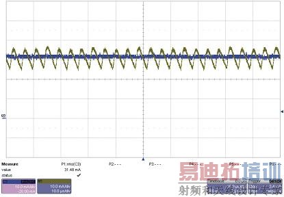 图5中的DC波形显示了在图6中DUT的输入端增加一个电容器之后的输入电流情况。正确放置输入电流表可以完成对平均输入电流的精确测量。尽管通过电流表的电流波形是纯DC电流,但新增电容器产生的电流却与上述的三角波形相似,没有DC漂移。因此,可将电容器的作用看作将输入电流分为DC和AC电流。要确定新增输入电容器的值,我们可以将起始值定为电源输入电容器的21倍。用一个电流表和一个示波器来测量实验室电源的电流,确保其是DC波形。如果仍有AC分量,我们可以再增加一个电容器。新增的电容器的ESR应该很小(<100莫姆)。