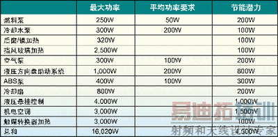 表1列出了各种可以通过智能开关来降低功耗的汽车负载。目前,由于很多这些负载仍通过内燃机采用机械方式驱动,因此控制起来比较困难。冷却水泵是一个便于通过电力驱动装置进行控制或调节的设备,另外一个适合的应用是液压方向盘控制:仅当导向轮需要转向时才消耗功率。与之相比,即使在直线行使时,现在的轿车也总是需要消耗一千瓦的功率。