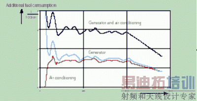 为说明节省燃料的潜力,图3显示了一款中档车辆由发动机(80A)和空调系统引起的额外燃料消耗。为了便于测试,这两个系统是相互断开的,这样,能量都只由电池提供。在这些条件下,我们通过EUDC循环来确定耗油量。可以看出,当这个周期开始时,即在平均速度较低时,耗油量很大。随着这个周期时间的延长,在较高速度阶段,额外消耗降低到大约每百公里2-3升。我们发现,对一个输出功率默认为1千瓦左右的发电机,上面提到的每百公里额外消耗是非常保守的估计,仅在最优引擎速度时才能达到。