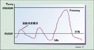这些好处可以通过油泵的例子展示出来。不论车速多高,油泵和发动机所消耗的功率都在80到250瓦之间,具体数值同设计有关。发动机输出设计成在全速状态下需要最大流量燃油。当引擎闲置时,多余的燃油通过安全阀返回到油箱,此时操作油泵只需要几瓦的功率(图2)。因此如果油泵能设计成按实际需要提供燃油,那么该发动机的平均功耗将被减少到5瓦到50瓦之间,具体数值取决于油泵容量。