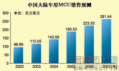 这些应用拓展促使MCU在性能上不断提升。同时也使汽车内MCU的用量从最初的20颗上升到现在的近百颗,最新的宝马汽车(S级)的MCU用量已经达到100颗以上。(图1)在具体应用上,8位MCU主要用于仪表控制、车窗控制、前后照镜控制等,随着控制精度需求的提升,目前,16位MCU正取代8位MCU成为增长车用MCU中最快的器件,32位MCU则主要用于发动机控制、汽车导航、音响、汽车智能应用等。在中国,车用MCU的出货数量将保持2位数增长势头,图1为Isuppli提供的车用MCU中国销售额预测。