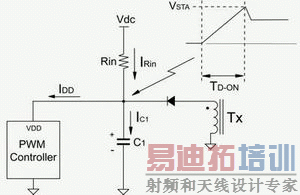 起动电路损耗在电源转换器空载待机损耗中占很高的比例,此处我们介绍一种起动速度快且损耗低的起动电路。图6(a)为传统起动电路,其中VSTA是脉宽调制控制器起始临界电压,TD_ON是启动延迟时间,TD_ON=(C1×VSTA)/IC1。使用较大输入电阻(Rin)可以有效降低电阻损耗,但启动延迟时间会延长。因此建议采用图6(b)电路,其中C1电容较小,这样在用大输入电阻时能够降低起动电路的损耗,同时仍然拥有较快起动速度。较大的C2电容可提供稳定的电压给控制器使用,不会增加起动延迟时间。