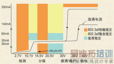 分级是由 PSE 完成的,它强迫端口电压进入分级范围,然后测量 PD 电流。在整个分级区域,PD 的电流必须符合表 1 所列的 3 个范围之一。尽管 802.3af 标准规定在检测和分级之间有超过 5V 的电压,但是这 5V 电压的大部分都被二极管正向电压(VF)随温度的变化给消耗掉。最高温度时,二极管的 VF 大约是 0.5V,而最低温度时这个电压大约为 0.9V。注意图 1 中典型 I-V 曲线的斜坡。如果检测与分级之间的过渡处理得不够平滑,那么可能发生振荡,因为 PD 的分级电流可能使端口电压降低到分级范围之外。即使有来自 PSE 的稳定电压,PD 电流的迅速变化加上电缆 100m 的电感也可能引起振铃。电压在 20.5V 以上时断开分级电流所产生的负电阻可能引起更严重的振荡和互用性问题。为了最大限度地提高互用性,PD 应该尽力实现平滑单调的 I-V 曲线,如图1所示。