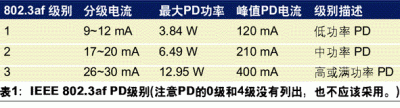 表1:IEEE 802.3af PD 级别(注意PD的0级和4级 |