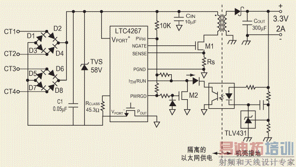 图3 中在 DC/DC 转换器有关的最重要方面是输入与输出之间的隔离。大多数 PD 需要隔离的 DC/DC 转换器,因为 802.3af 标准要求以太网插座引脚与 PD 之外的其它任何导电部分隔离。隔离的 DC/DC 转换器满足这一隔离要求,其余 PD 电路可以设计成没有附加隔离措施。