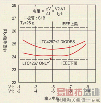 在建立 PoE 连接的过程中,检测是第一步也是最重要的一步。PD 具有 25k 共模电阻,而非用电设备具有 150 电阻或开路共模终端。在 2.7V 和 10.1V 之间,PD 必须具有 25±1.25k 检测特征电阻。除了图 3 中与 LTC4267 一起画出的电阻本身,二极管电桥是 PD 25k 检测特征电阻的最重要部分。这些二极管的正向电压使特征电阻上的电压产生了偏移,IEEE 标准要求这个偏移小于 1.9V(对于在 -40oC 温度下工作的硅二极管足够了)。如图 4 所示,这些二极管的非线性串联电阻影响特征电阻。反向偏置电桥二极管会有泄漏,两个并联二极管的泄漏在 10.1V 反向偏置时必须低于 IEEE 规定的 10μA。如图 4 所示,LTC4267 通过集成和优化特征电阻以补偿二极管电桥和它自己的电源电流,极大地减轻了这些问题,减轻了设计师的负担。