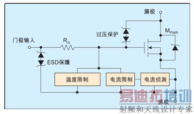 图1显示了完全自保护MOSFET的一般拓扑结构。这些器件常见的其他特性包括状态指示、数字输入、差分输入和过压及欠压切断。高端配置包括片上电荷泵功能。但是,大多数器件都具备三个电路模块,即电流限制、温度限制和漏-源过压箝制,为器件提供大部分的保护。