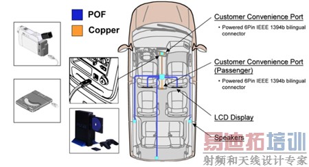 如图5所示,车载网络的架构可分为内嵌式网络和用户便利端口(CCP)。目前的技术规格将内嵌式塑料光纤(POF)车载网络定义为与现有的MOST(媒体定向系统传输)技术相似的规格。但是,前者的架构更加稳固、能够提供更高的数据传输速率,并且更易于实现。这个网络能够连接各种电子设备,例如DVD播放机、视频显示屏、导航系统、收音机接收设备、通讯设备,如无线电话或应急自动远程通信及信息处理技术术语,以及其它的多媒体应用。