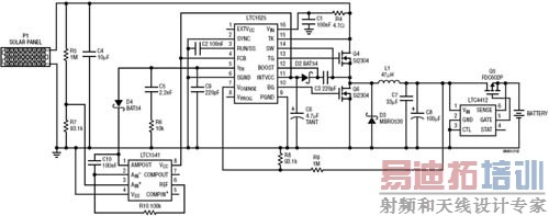 传统观念认为图 2 所示的电路将不会带来多大的好处,但是,传统观念基于的是传统器件。该电路是一个开关模式的充电器,基于异常高效的 LTC1625 No RSENSE (无检测电阻器) 同步降压型控制器。该电路被置于太阳能电池板和电池之间,并负责调节电池浮动电压。附加基于 LTC1541 的控制环路强制充电器在太阳能电池板最大功率的条件下运作。效率的增加缩小了太阳能电池板所需的尺寸,从而降低了总解决方案的成本。