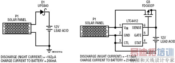 图 1 太阳能电池板在不用时会泄漏电流 (黑暗环境或夜晚期间的放电电流),因而导致电池电量的潜在消耗。采用简单二极管的解决方案能够减小放电电流,但它也会引起一个使电池充电电流减小的电压降。一种更佳的解决方案是采用一个基于 LTC4412 的理想二极管,与传统二极管相比,这种理想二极管可使反向漏电流减小一个数量级,并具有极小的正向电压降,从而增加了充电电流